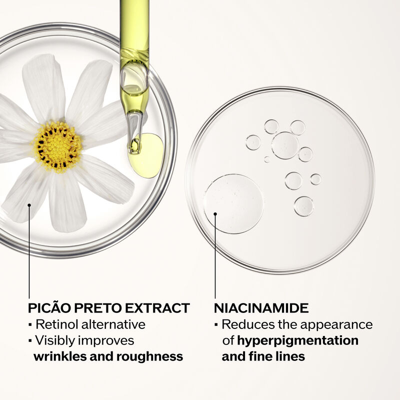Formulated with Picão Preto Extract, a gentle, plant-based retinol alternative. This powerful ingredient helps reduce the appearance of wrinkles and roughness. Niacinamide, a form of Vitamin B3 known for its many skincare benefits, helps to reduce the appearance of hyperpigmentation and minimize age spots while strengthening skin's barrier and overall condition. Combined together, these ingredients help support skin's natural collagen and dramatically improve the appearance of dark spots and wrinkles without irritation.
